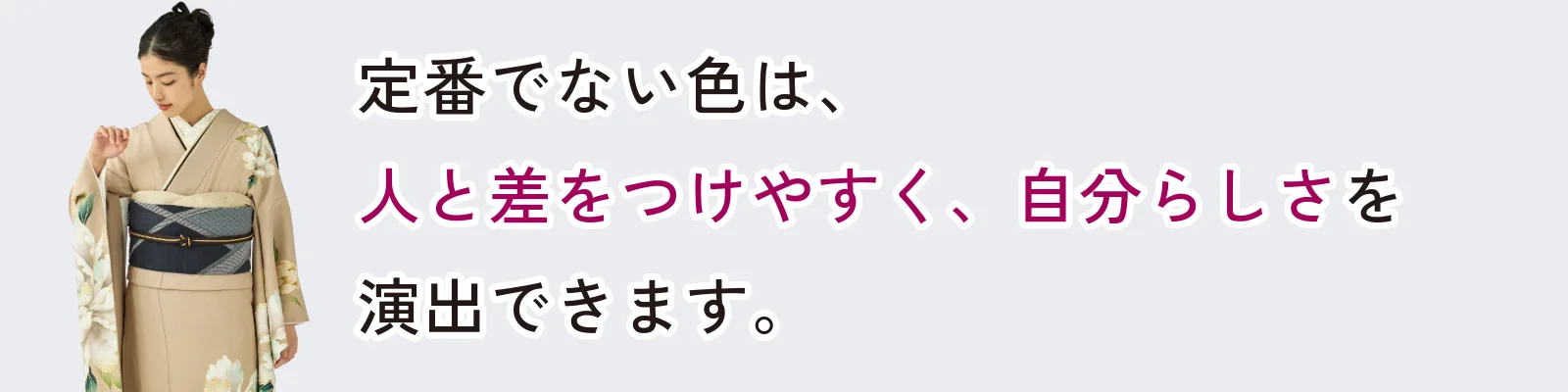 成人式の振袖選びでは、あえて人気の定番カラーではない色を選ぶことで周りと差をつけ、個性を引き出せます。中でも、紫色や茶色、黄色、オレンジ、グレーなどは選ぶ人が少ないためかぶりにくく、特別感を演出できるのが魅力です。