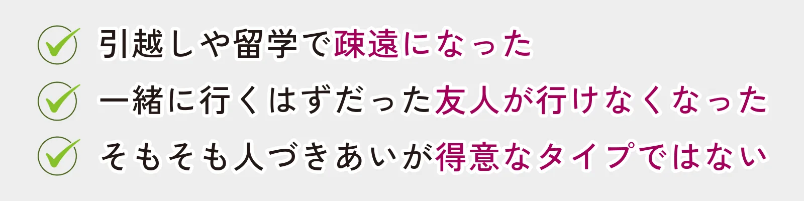 成人式に一緒に行く人がいないのは、引っ越しや留学で疎遠になったり、約束していた友人が参加できなくなったりなど、その理由はさまざまです。ここでは、代表的なケースを紹介します。
