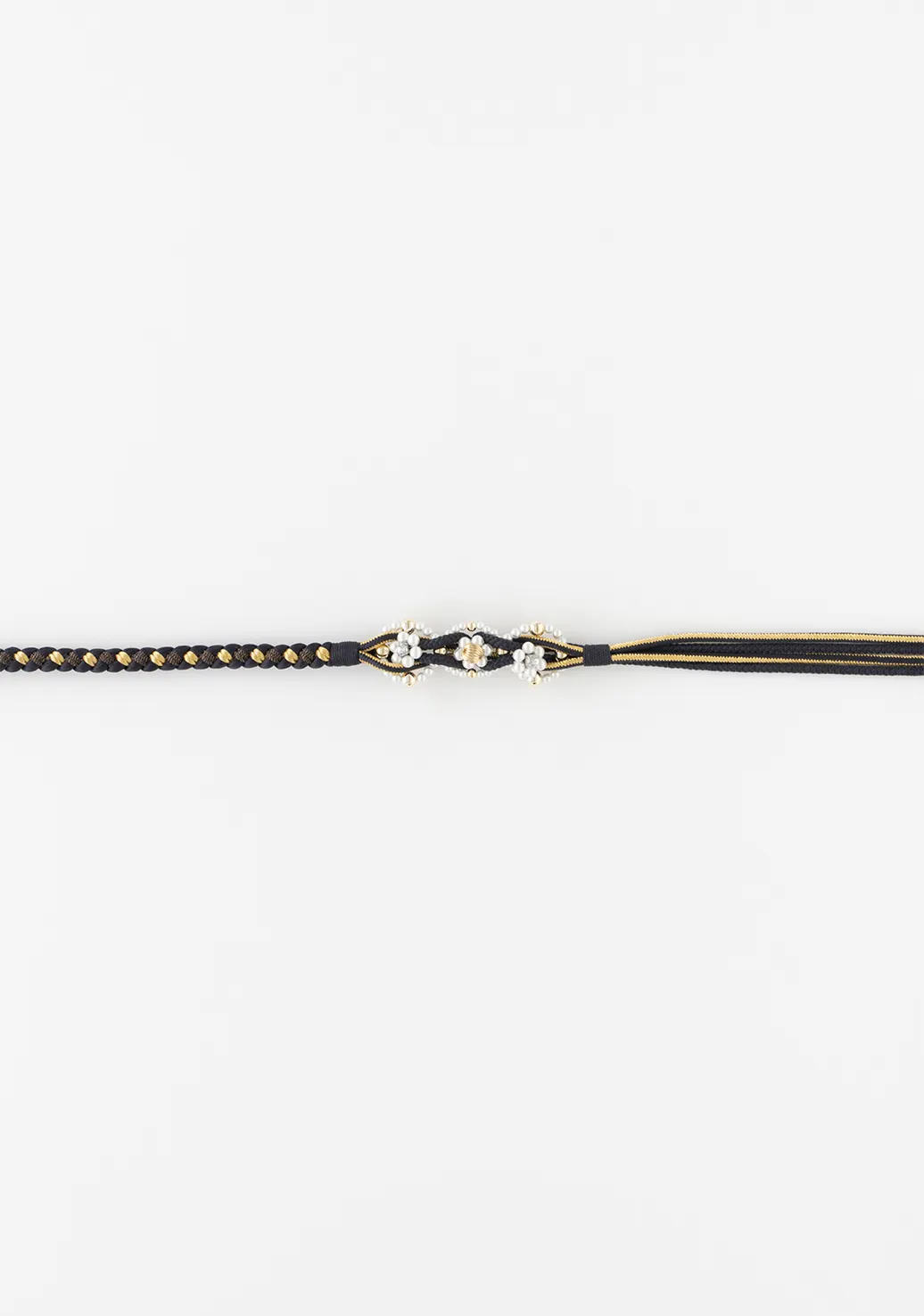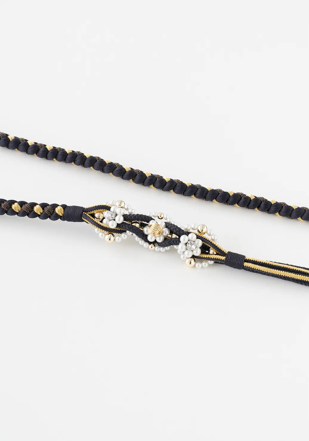 小粒のパールで作られた花々が 3 つ並び、帯回りを品よく彩ります。軸の色は白・紺・黒とシックな配色で、パールが映える色合わせにしています。
