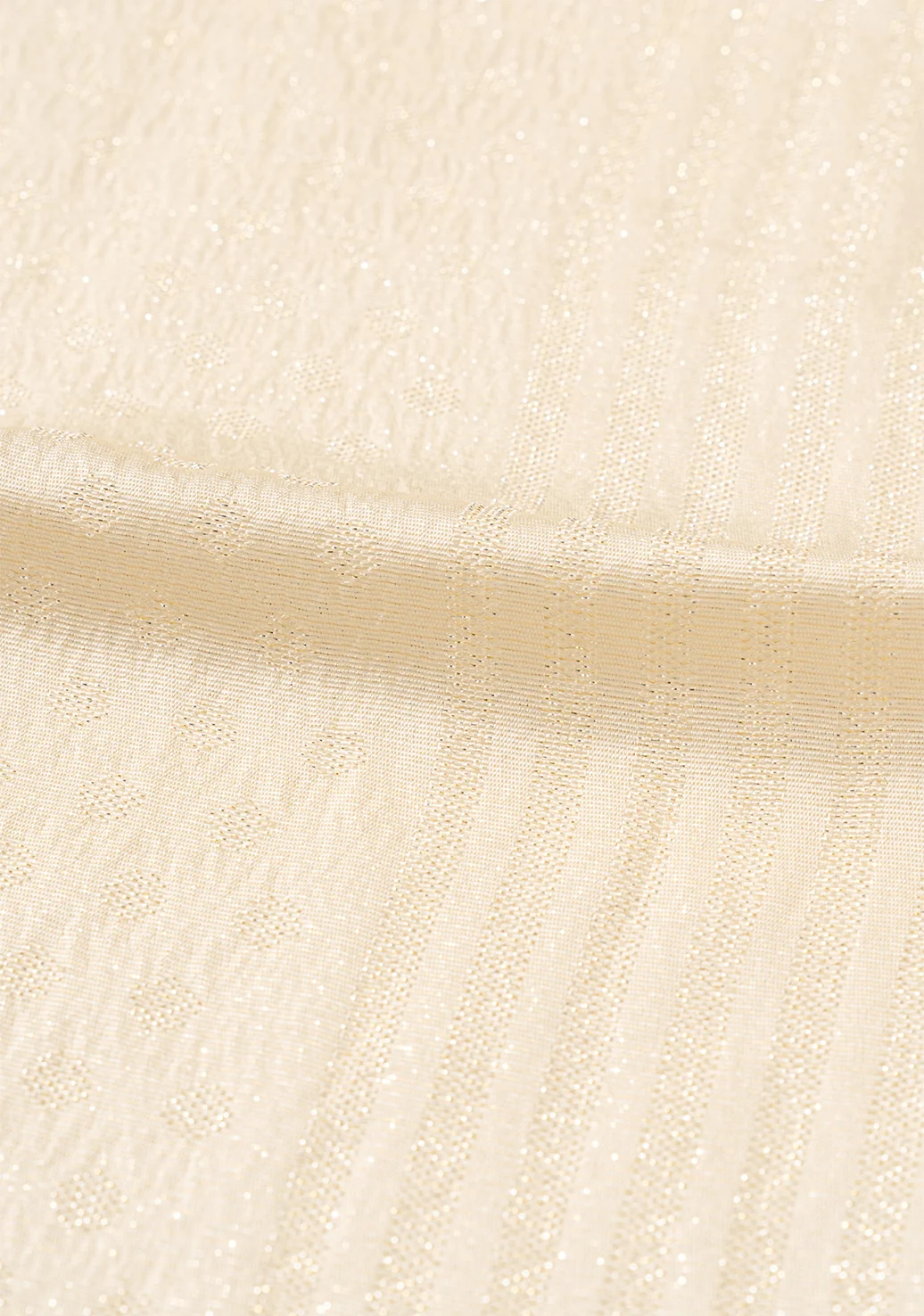 帯揚げの中心で柄が分かれている、2WAY 仕様の帯揚げです。ドット × ストライプのオリジナル地紋で、結んだ時の美しさを考え、柄の大きさを調整しています。金銀糸が織り込まれているため、帯回りを華やかに飾ります。