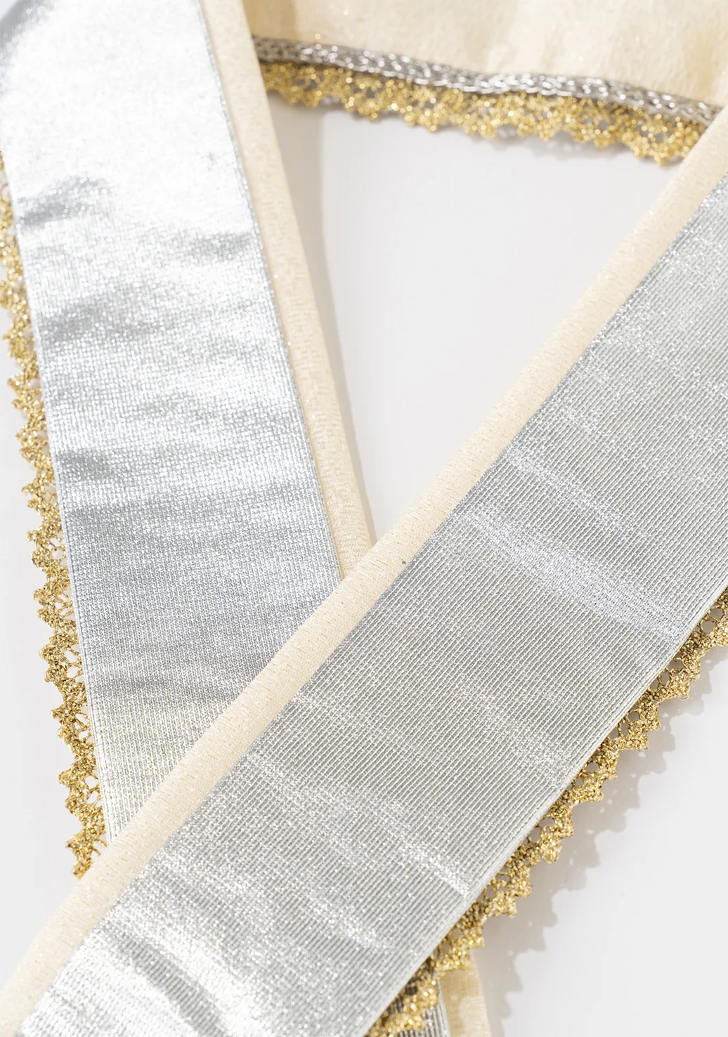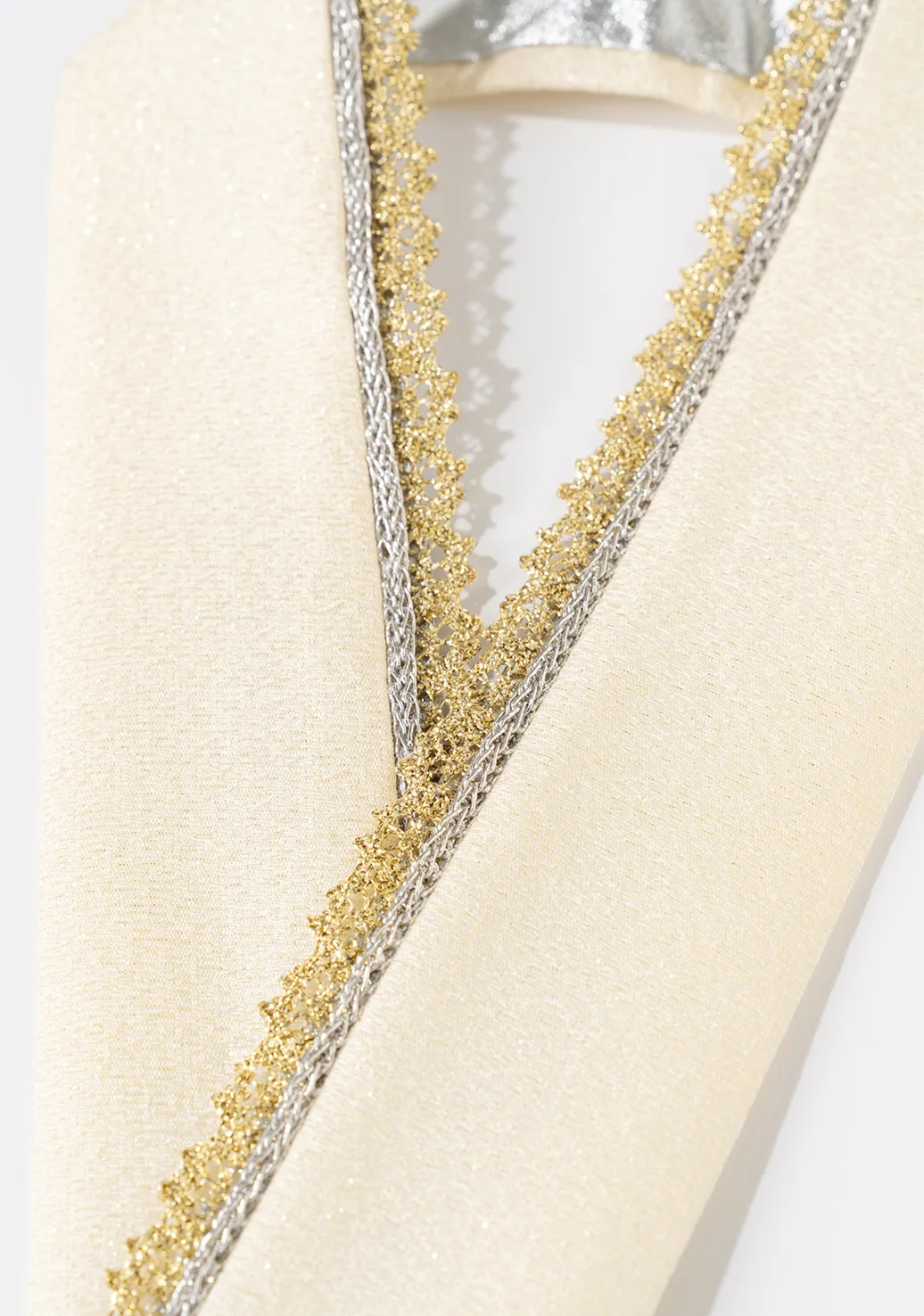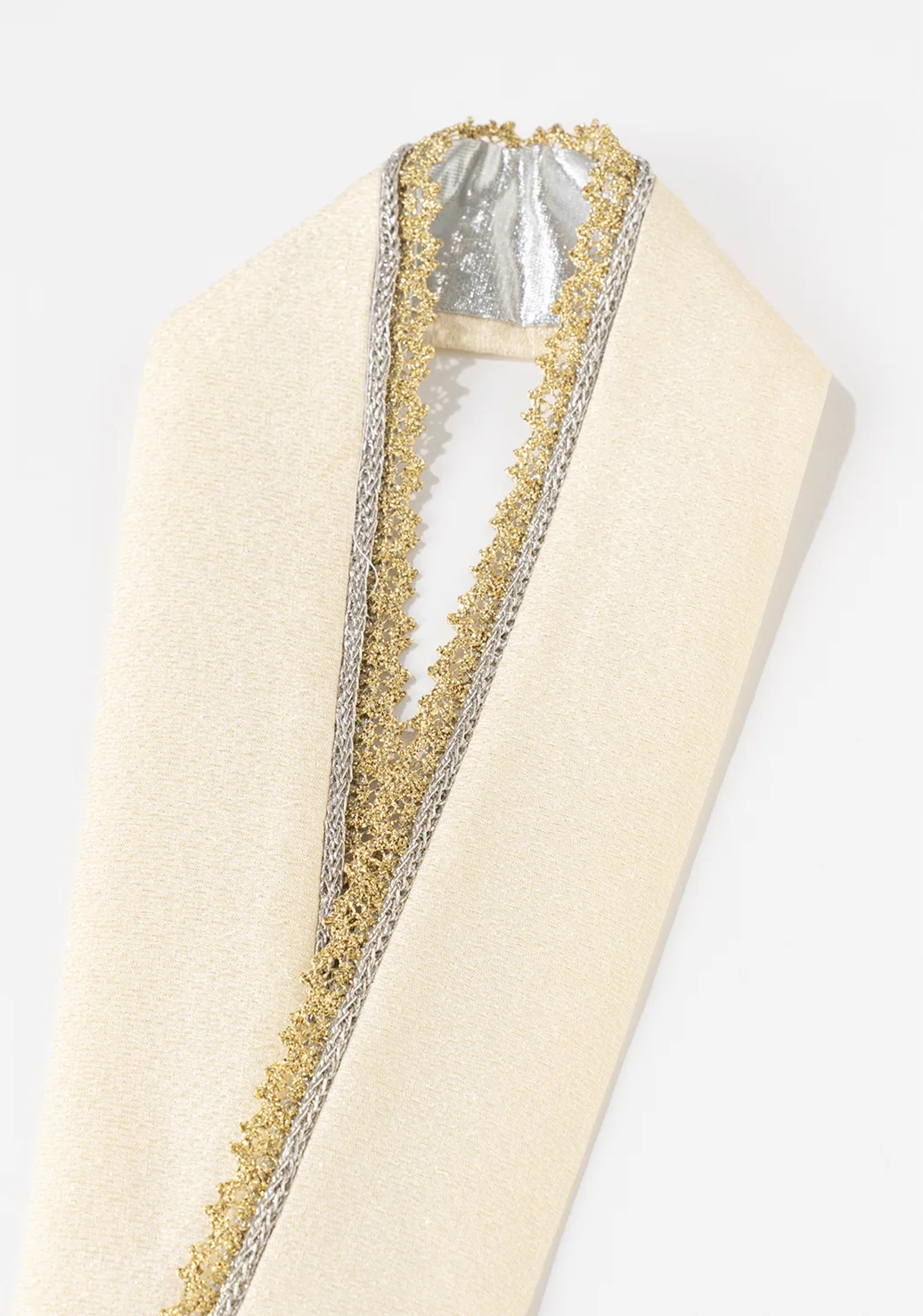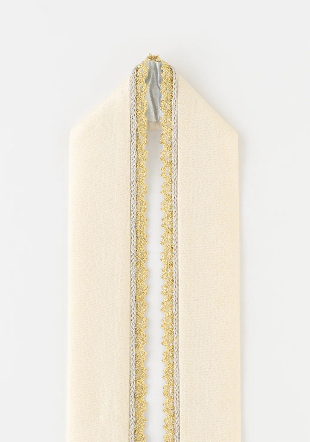 柔らかく華やかなカラーで、顔回りをパッと明るく彩ります。銀通しの生地に金・銀 2 種のレースを合わせて、上品な輝きを纏う重ね衿です。合わせやすい 3 色展開です。