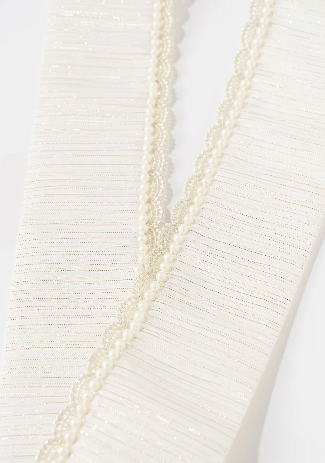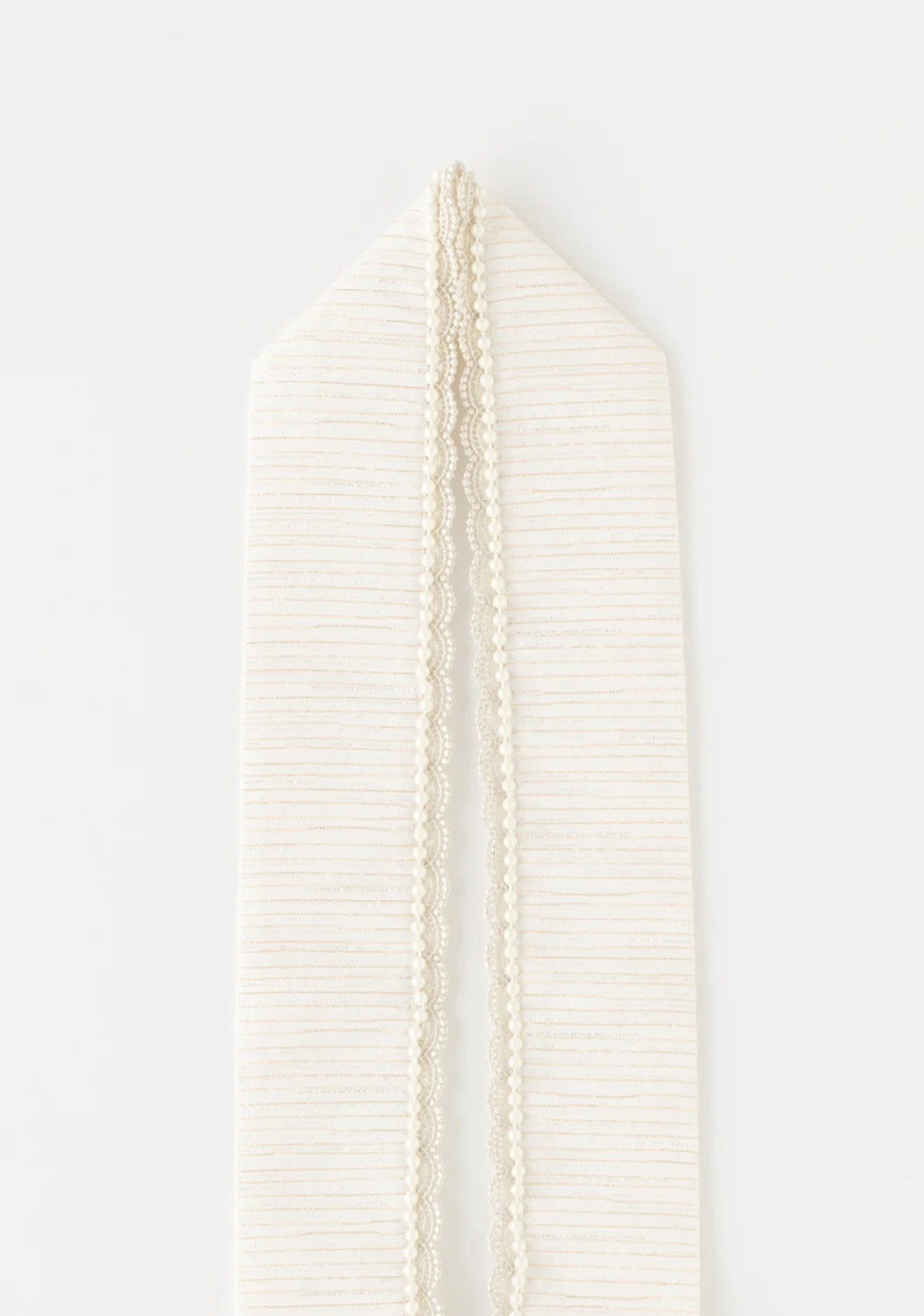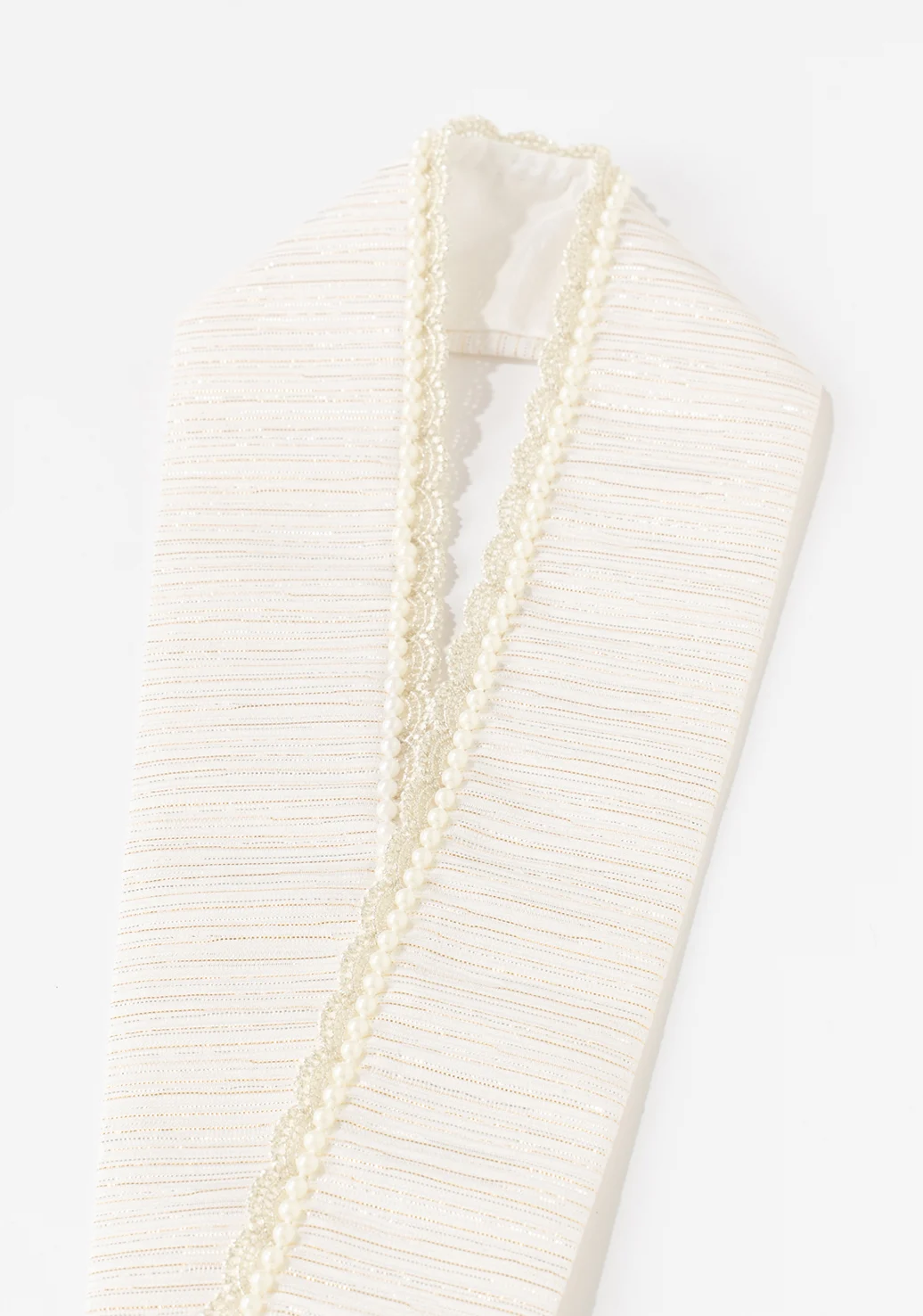 パールと丸みを帯びたレースが可愛らしい印象の重ね衿です。衿元に程よいボリューム感と華やかさをプラスします。生地はさりげなく光る金糸がポイントです。