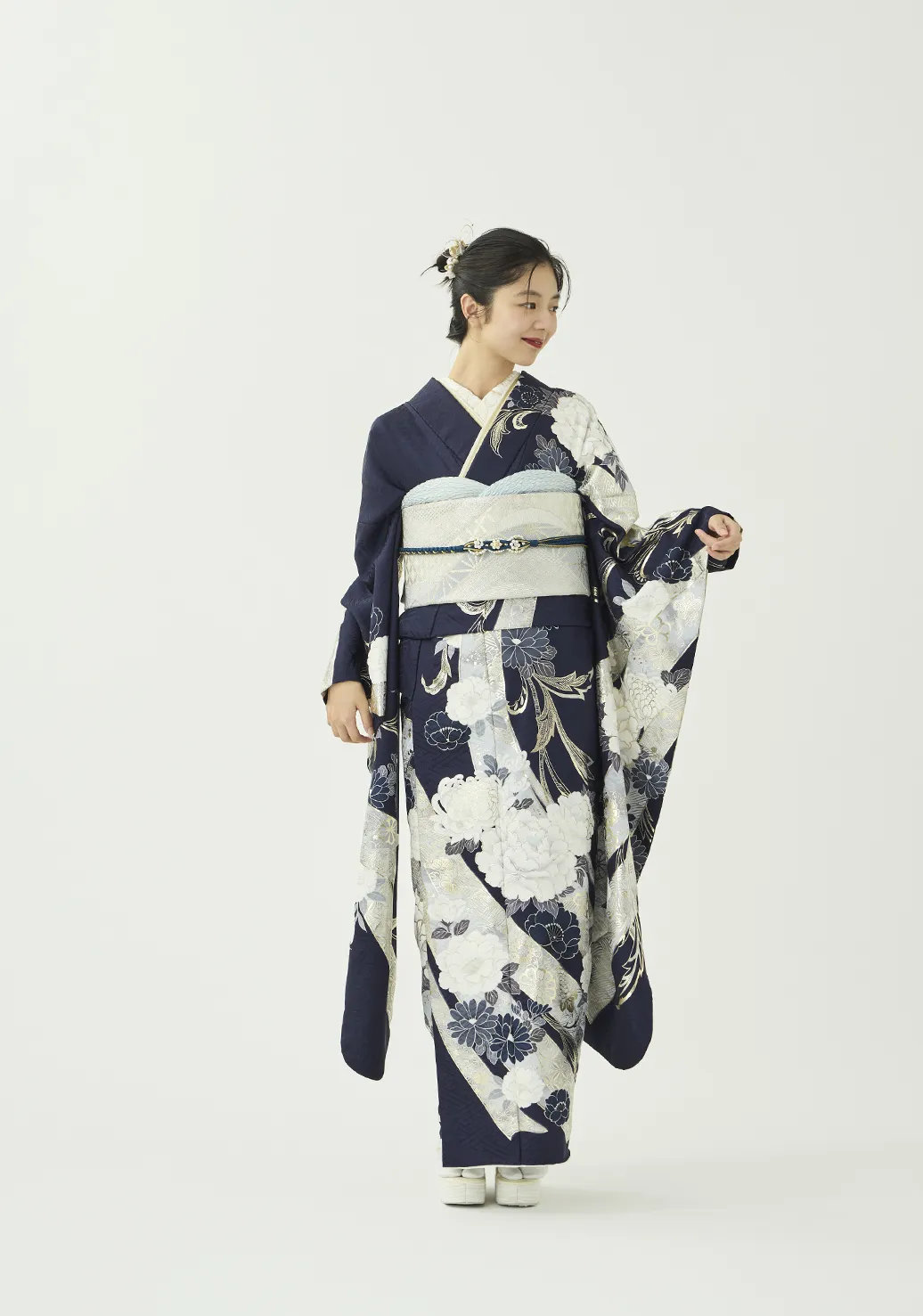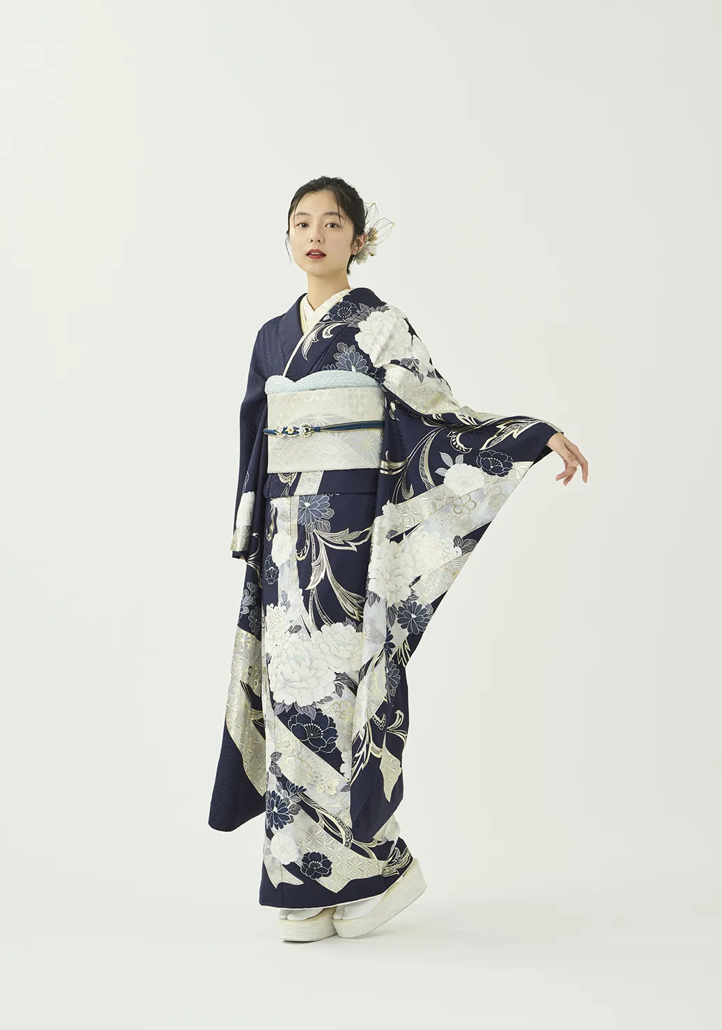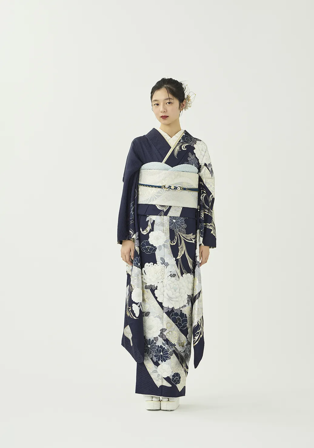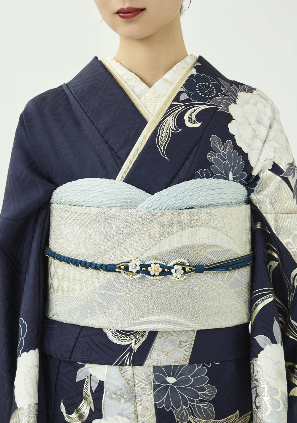 白い熨斗と牡丹に、プラチナ箔の品ある輝きを添えました。落ち着きのある紺の地色が柄の白を際立たせ、凛とした美しさを演出します。スタイリングはシルバーの帯に同系色の小物を合わせ、統一感のある装いに仕上げました。