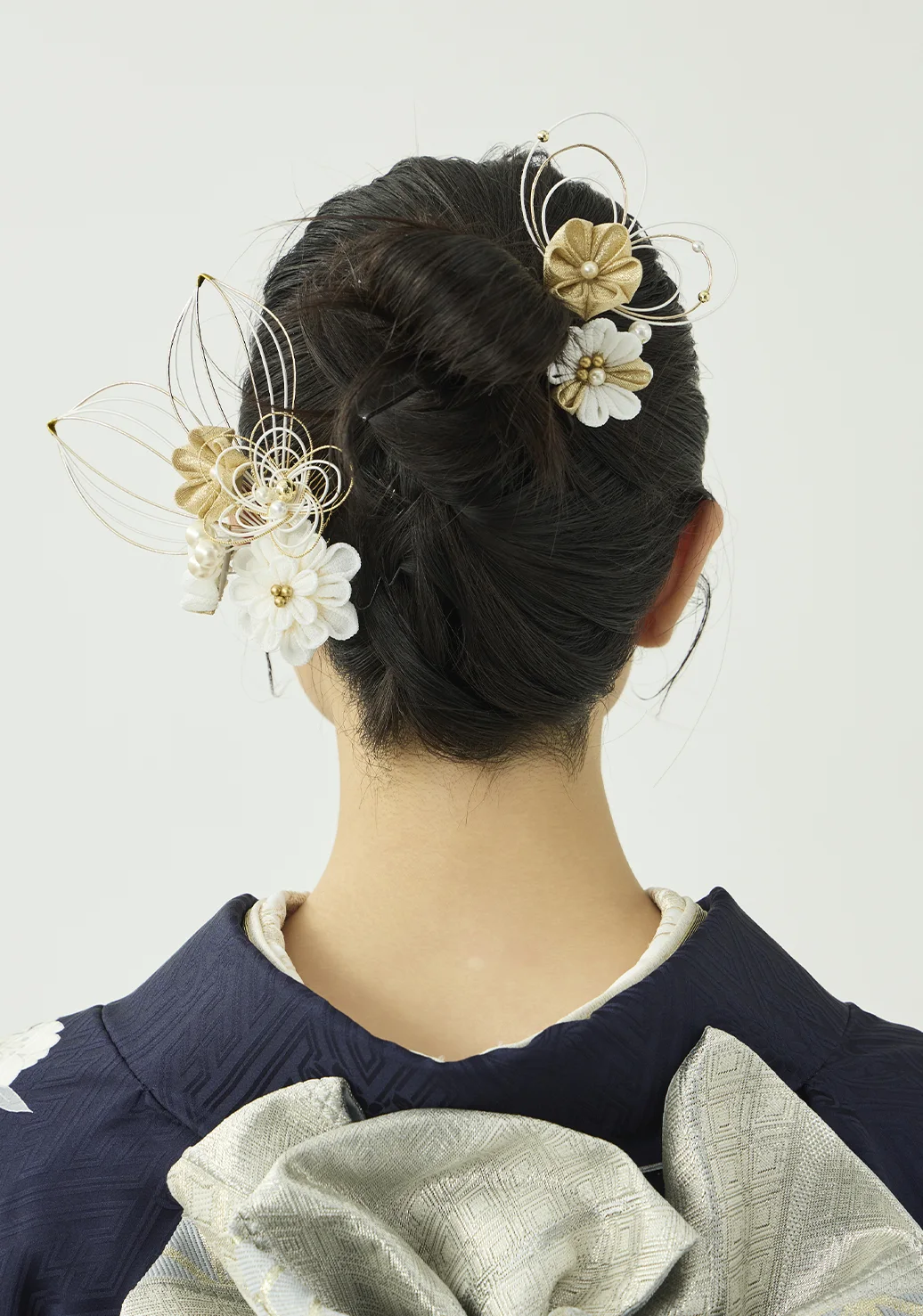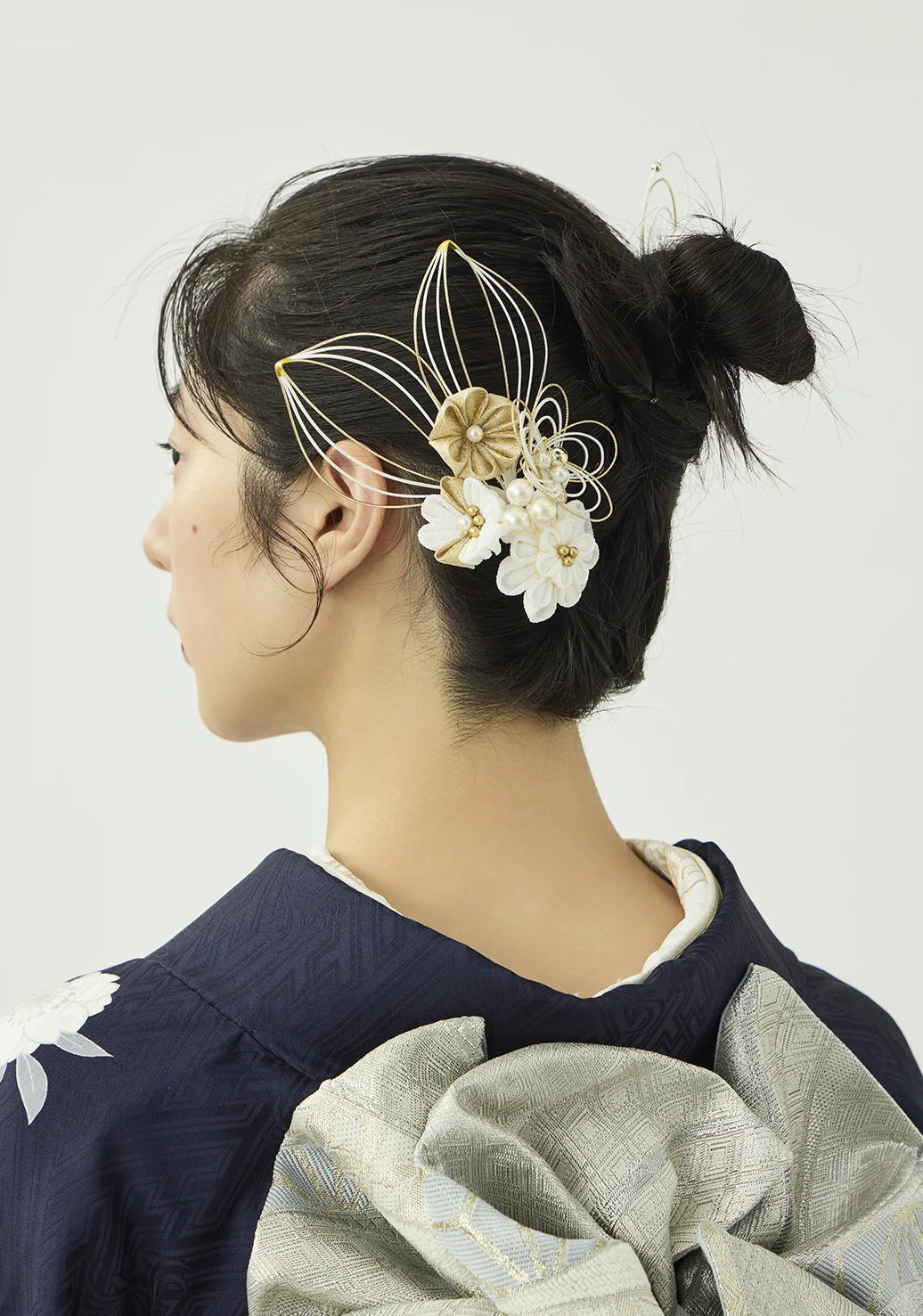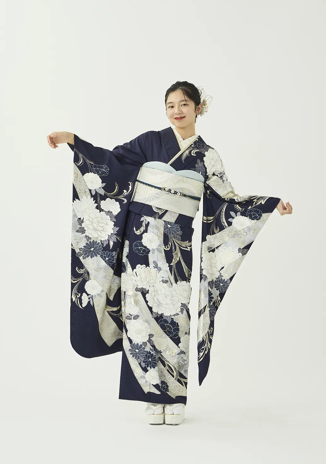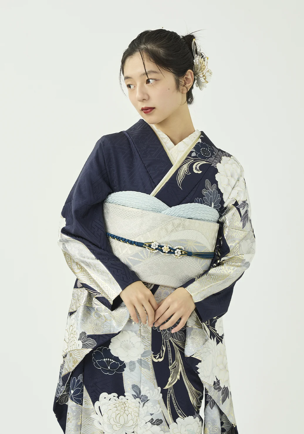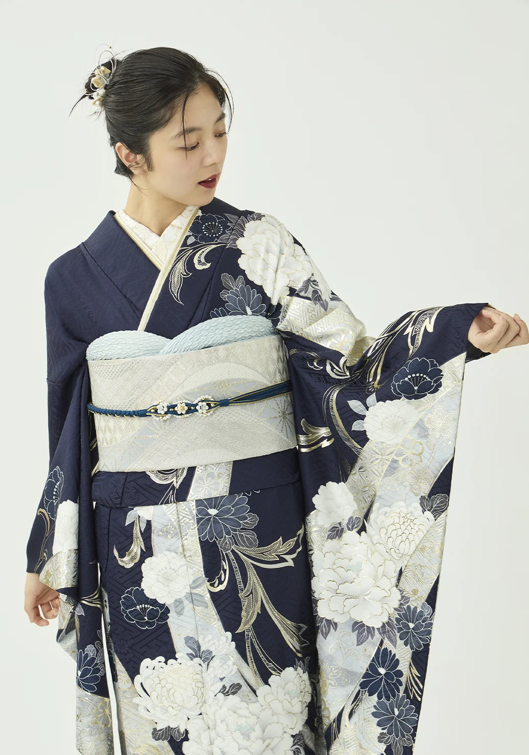 白い熨斗と牡丹に、プラチナ箔の品ある輝きを添えました。落ち着きのある紺の地色が柄の白を際立たせ、凛とした美しさを演出します。スタイリングはシルバーの帯に同系色の小物を合わせ、統一感のある装いに仕上げました。