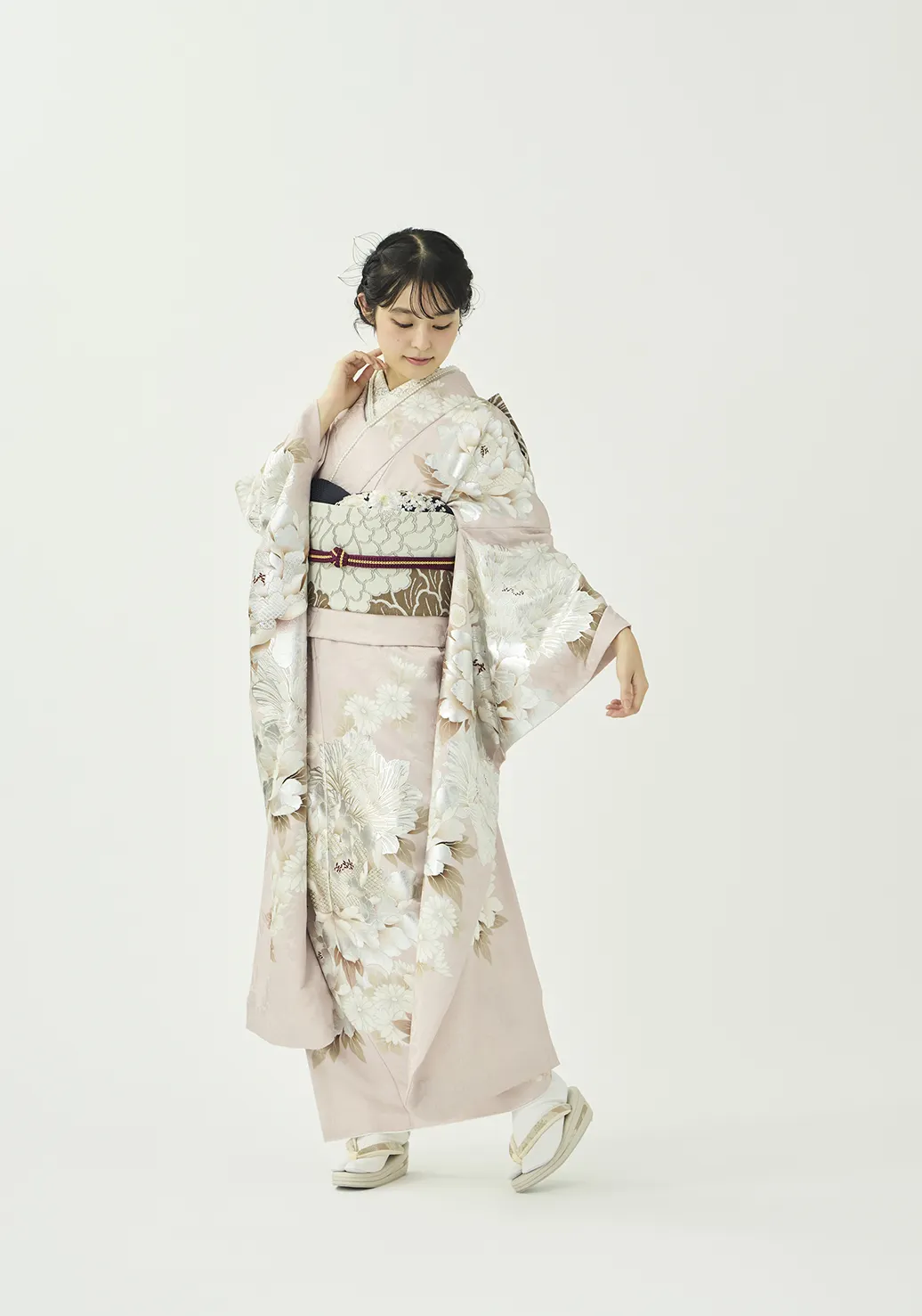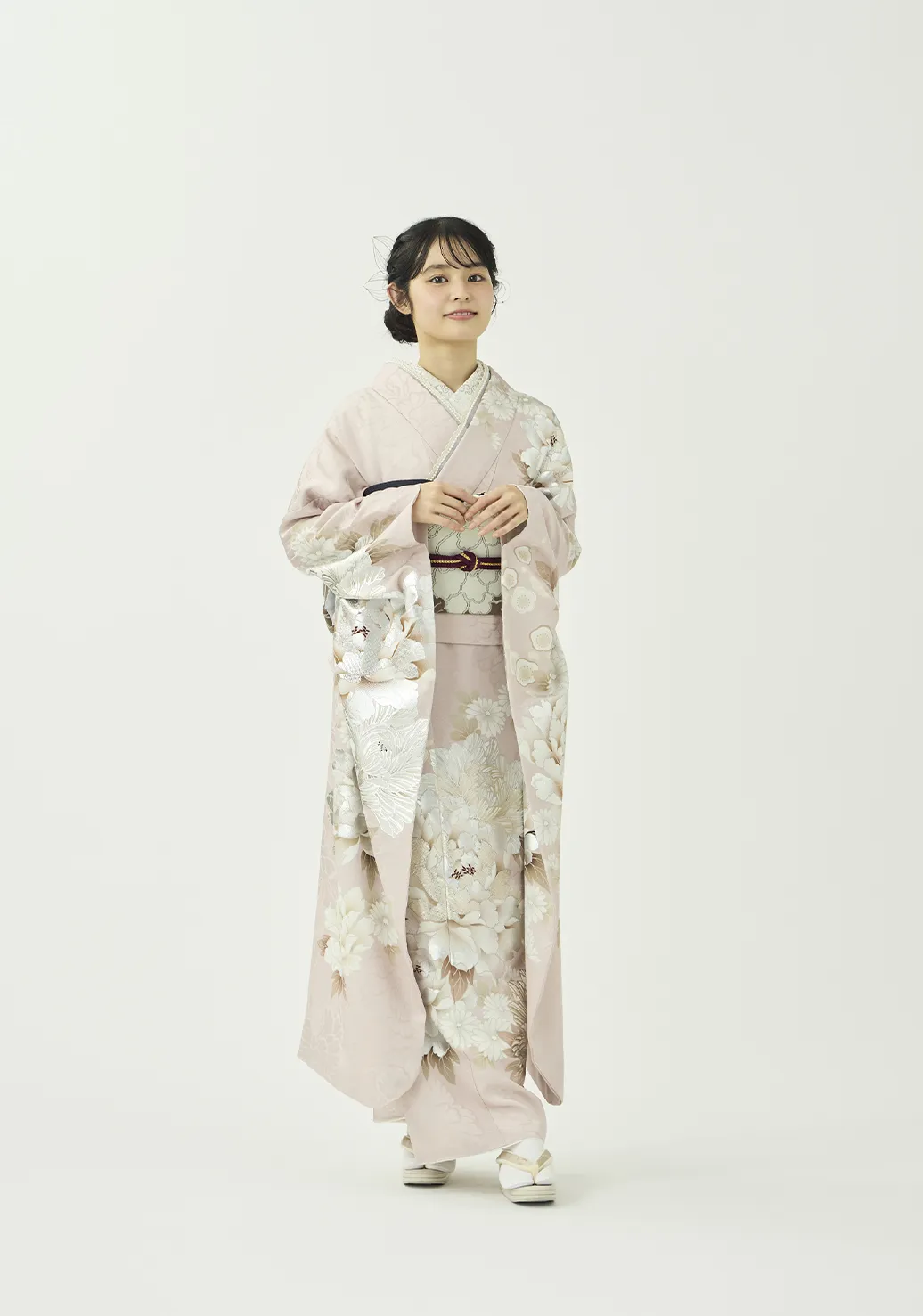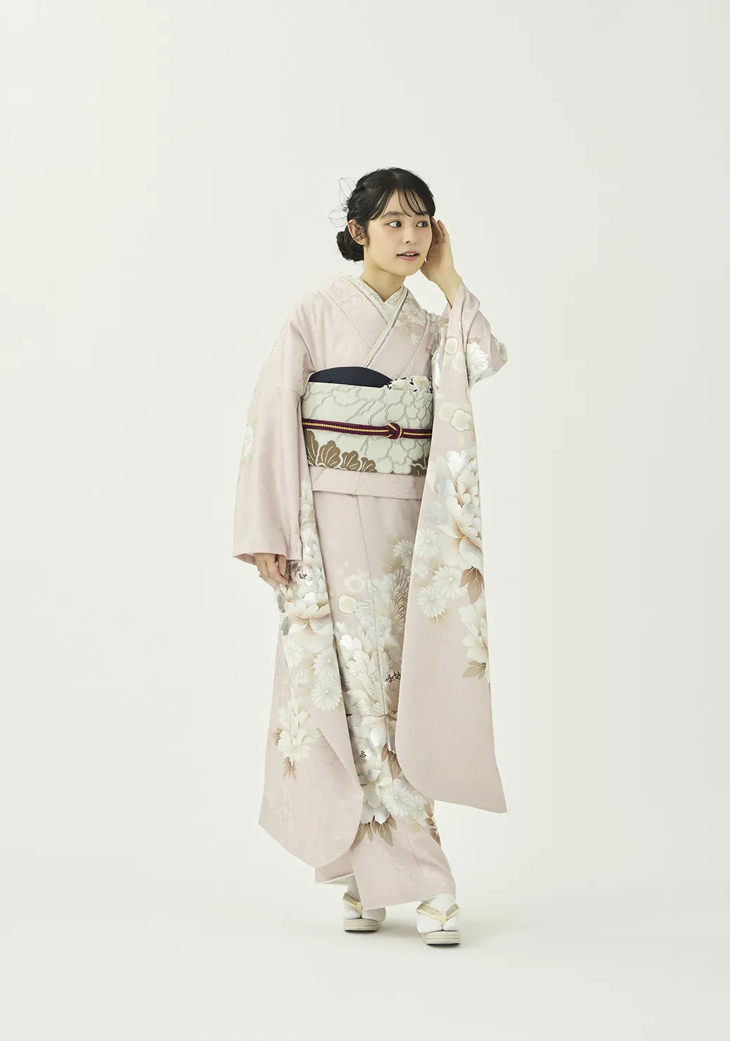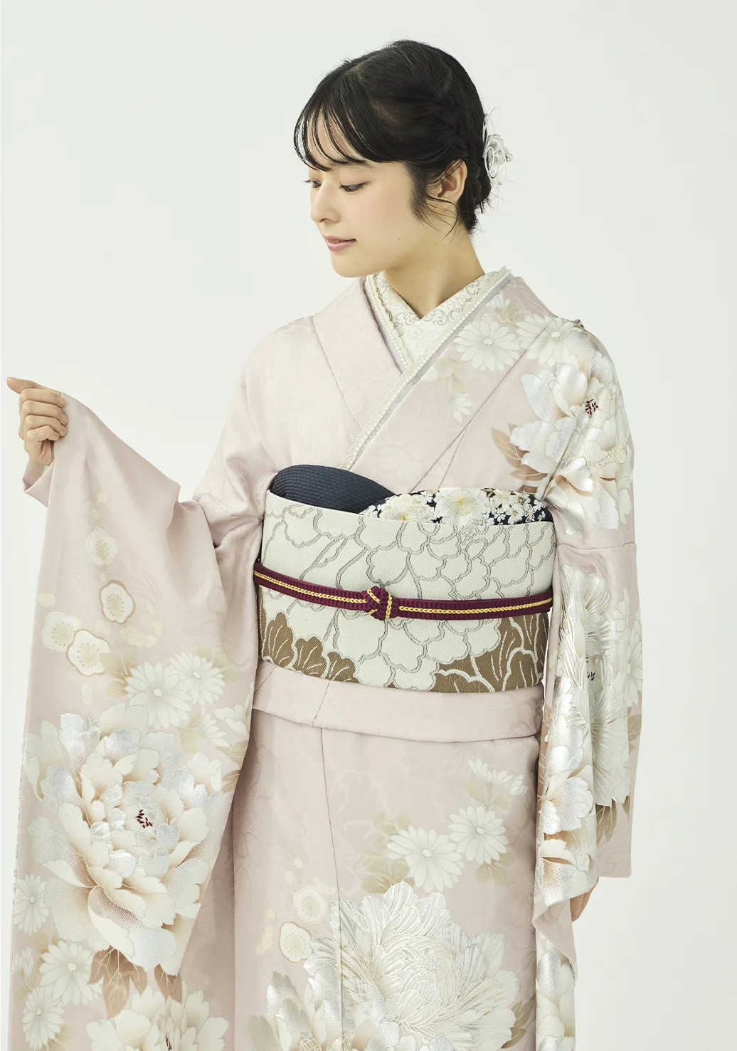 大きな白い牡丹が上品で可愛らしい振袖です。金の華やぎと銀の上品さを併せ持つプラチナ箔を用いることで、地色の絶妙な淡いピンクと調和しつつも華やかさを添えています。紺と紫の小物を合わせることで柔らかな中にも芯のあるコーディネートに仕上げました。