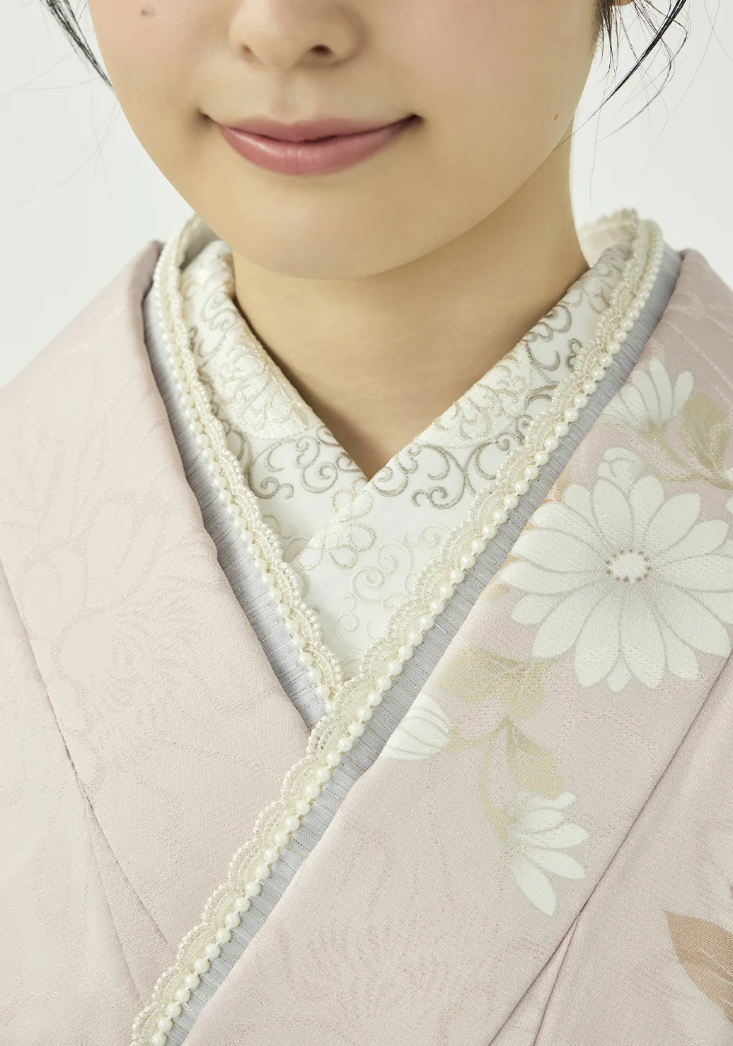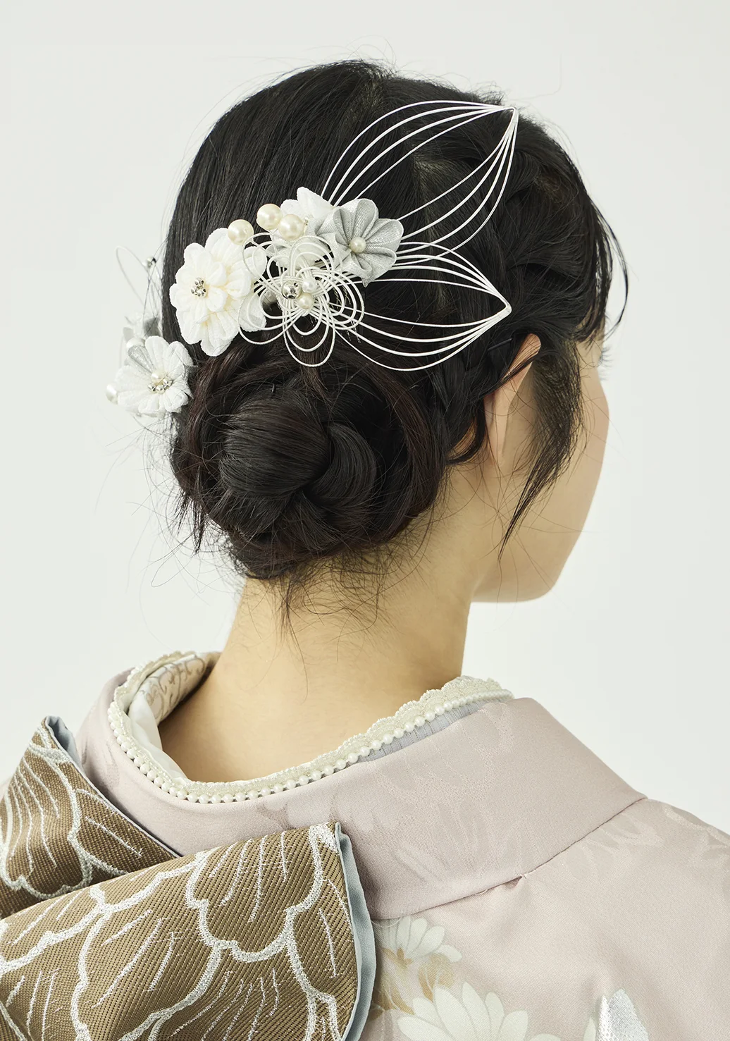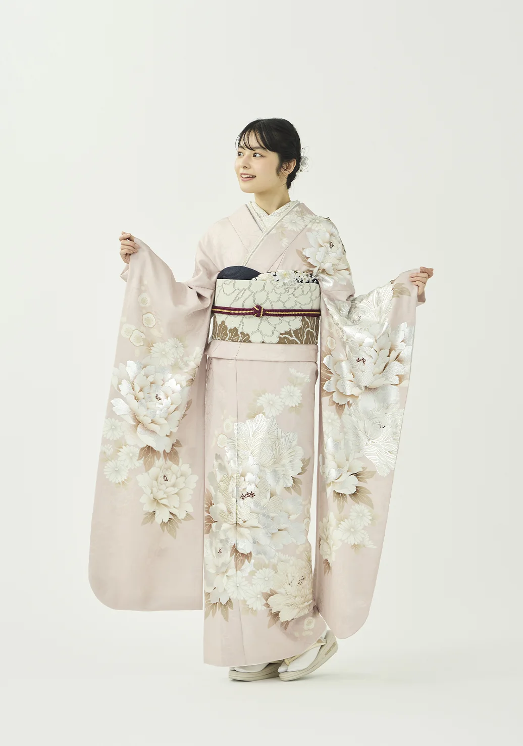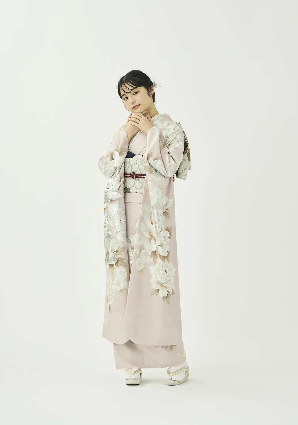 大きな白い牡丹が上品で可愛らしい振袖です。金の華やぎと銀の上品さを併せ持つプラチナ箔を用いることで、地色の絶妙な淡いピンクと調和しつつも華やかさを添えています。紺と紫の小物を合わせることで柔らかな中にも芯のあるコーディネートに仕上げました。