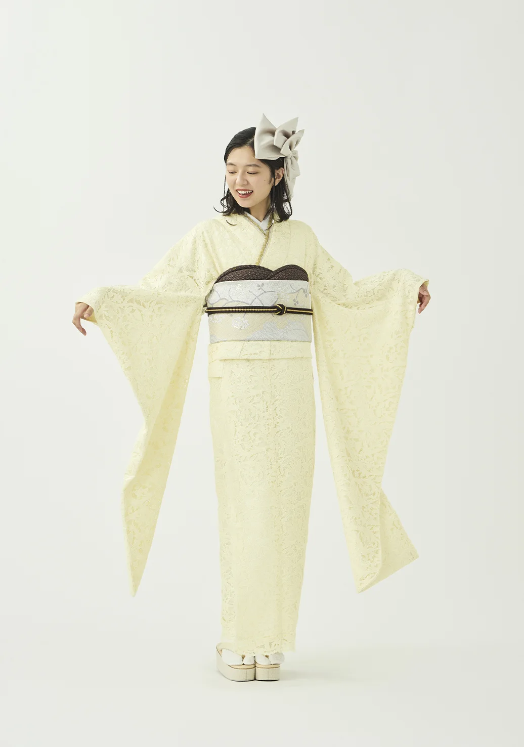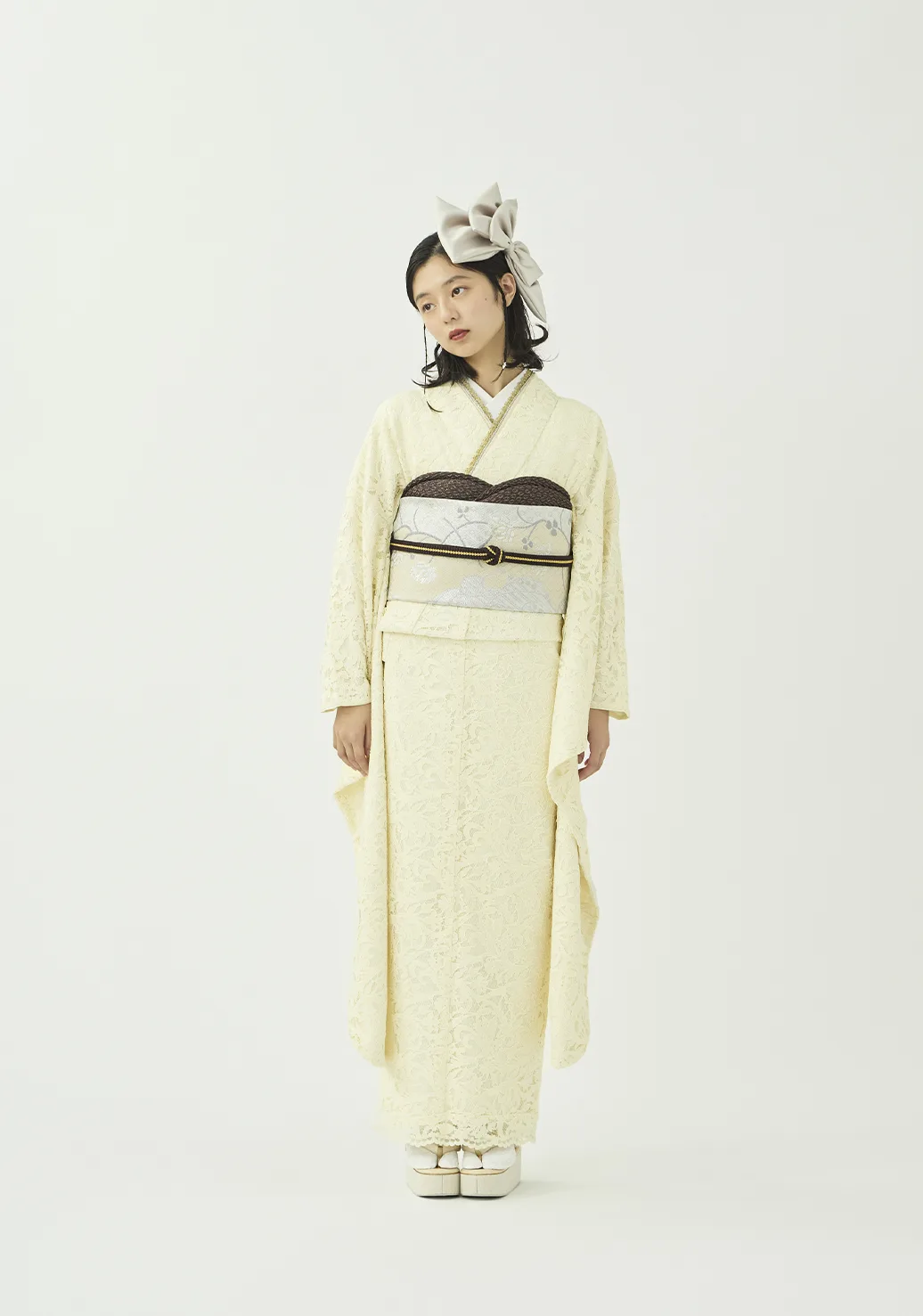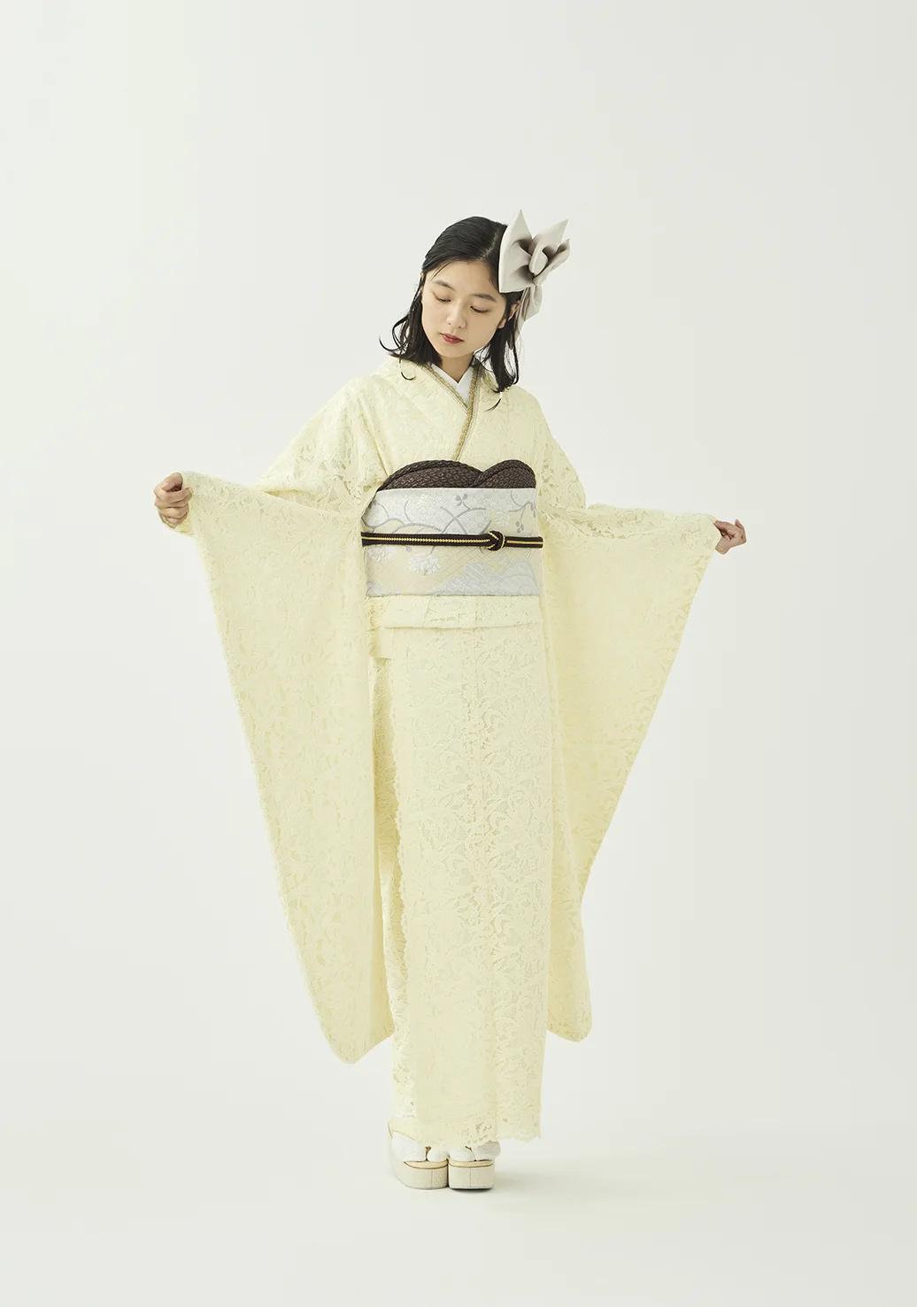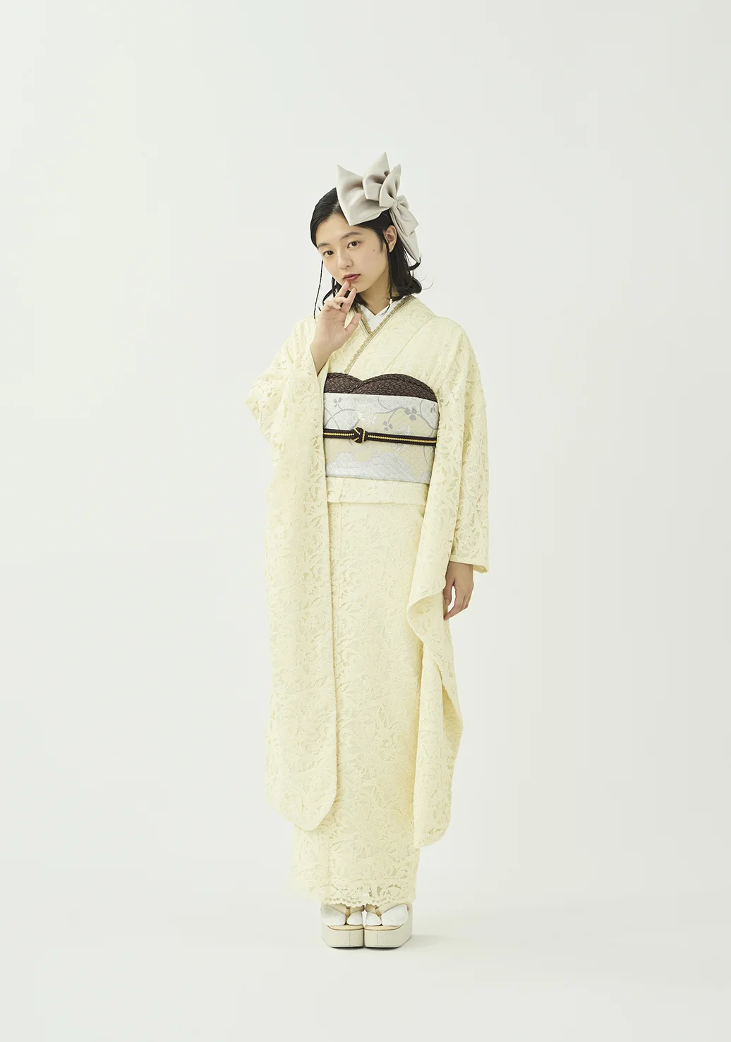 やわらかく可憐な印象の振袖です。光沢感のある裏地がレースの美しさを引き立て、上品で軽やかな雰囲気に。スタイリングは落ち着いたブラウンの小物を合わせ、クラシカルでまとまりのある装いに仕上げました。 ※レースの振袖は仕立て上がり品(M、L)のみのお取り扱いとなります。お客様の体型に合わせたサイズ(パターンオーダー)でのお仕立ては承っておりませんので、ご了承ください。