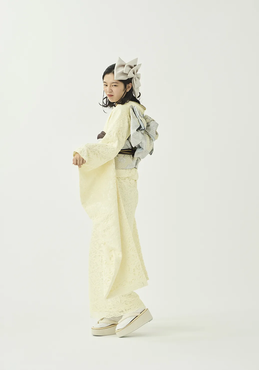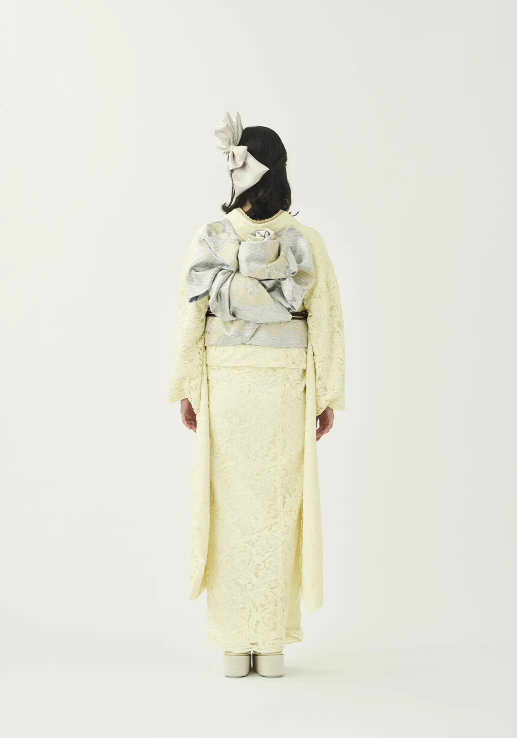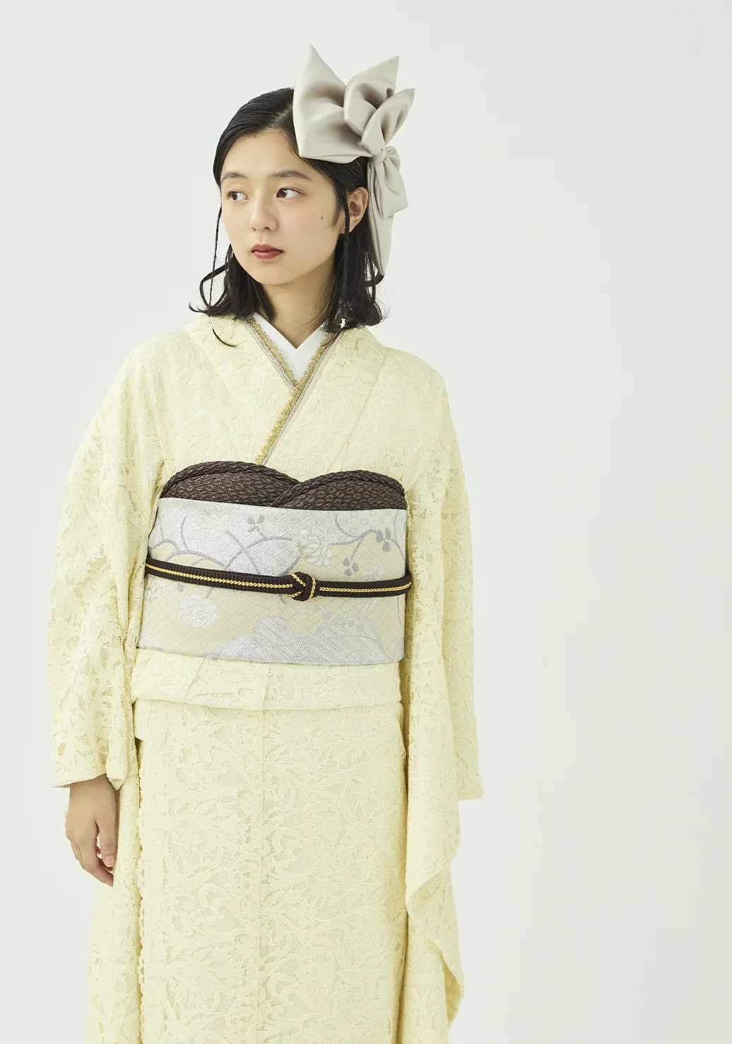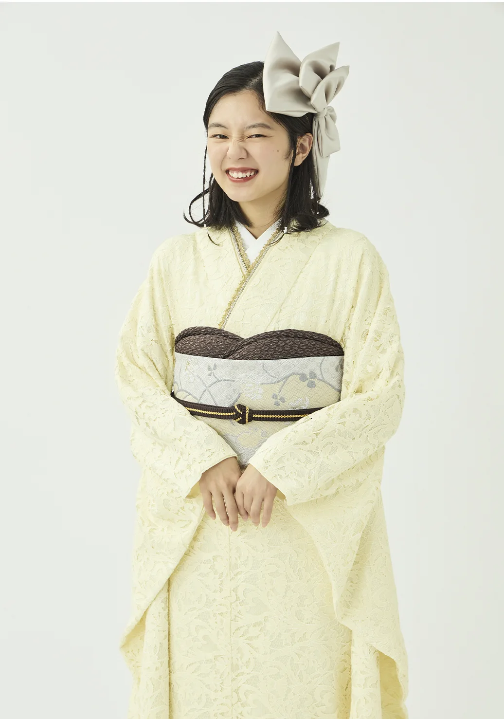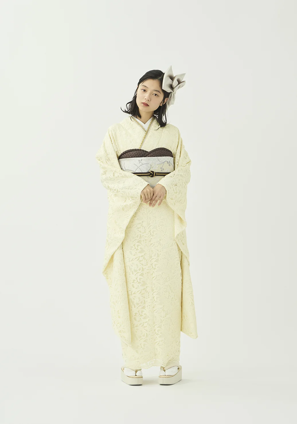 やわらかく可憐な印象の振袖です。光沢感のある裏地がレースの美しさを引き立て、上品で軽やかな雰囲気に。スタイリングは落ち着いたブラウンの小物を合わせ、クラシカルでまとまりのある装いに仕上げました。 ※レースの振袖は仕立て上がり品(M、L)のみのお取り扱いとなります。お客様の体型に合わせたサイズ(パターンオーダー)でのお仕立ては承っておりませんので、ご了承ください。
