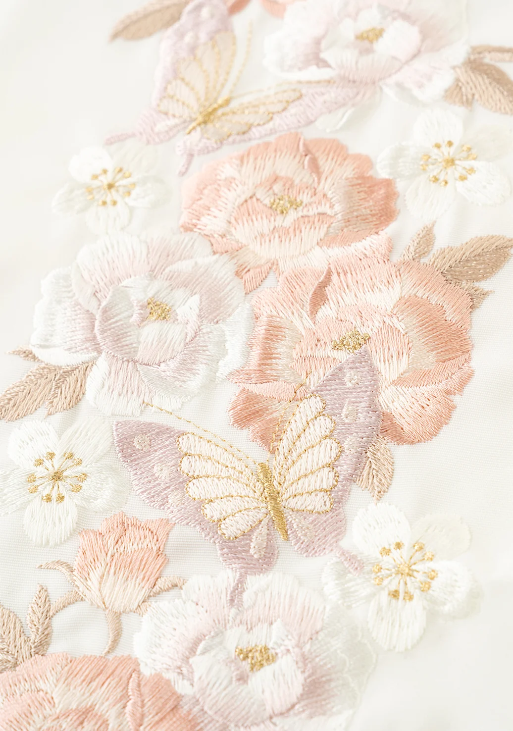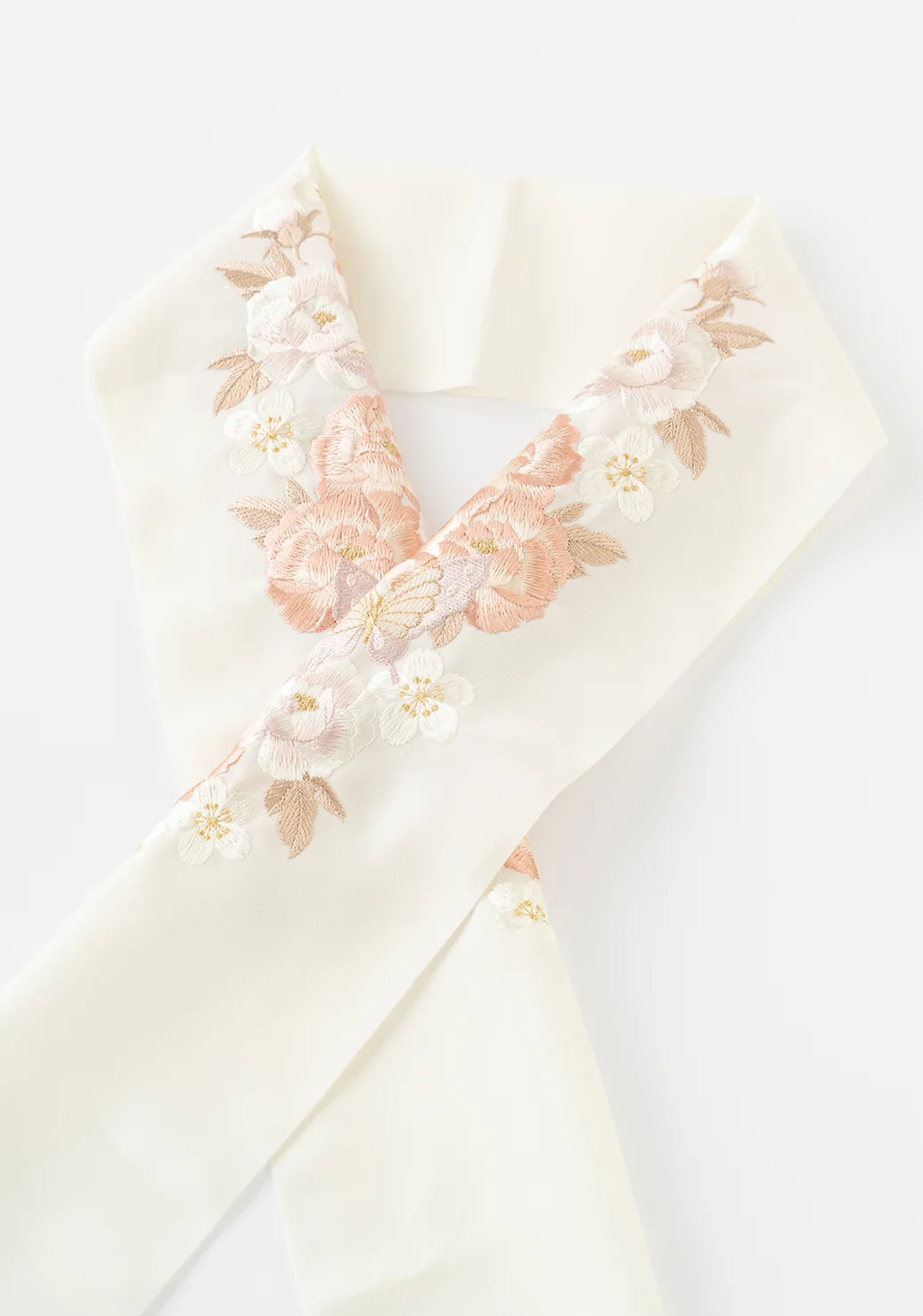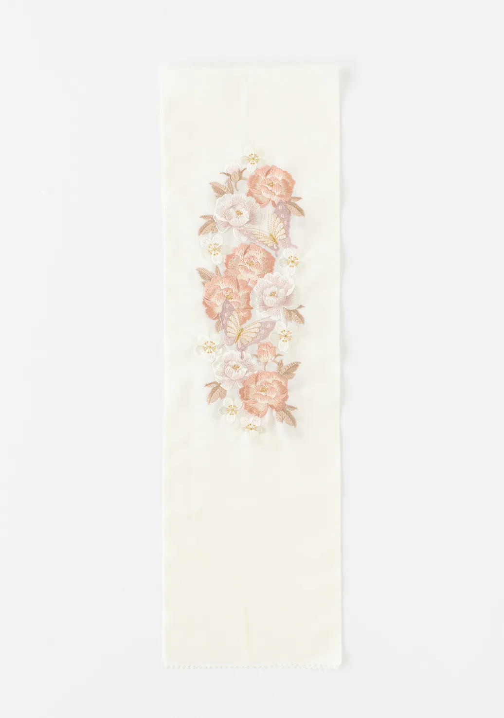 芍薬に蝶の振袖と合わせて製作した刺繍半衿です。可愛らしくも上品で繊細な表現にこだわりました。配色も可憐な印象の白やピンクをベースに同系色でまとめています。
